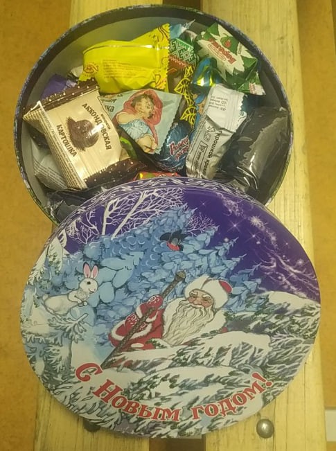 Другой участник беседы прислал фотографию детского подарка – коробку различных конфет. Сотрудники высказались, что нефтяная компания позаботилась хотя бы о детях.