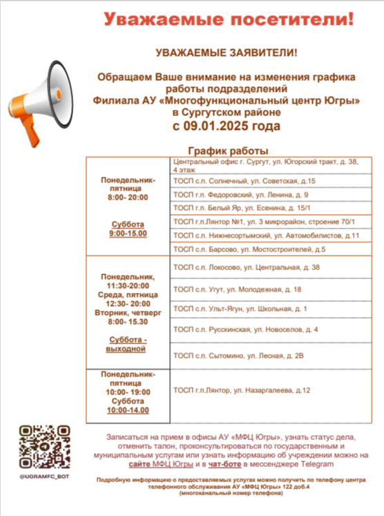 – С 9 января 2025 года изменяется режим работы филиала АУ «Многофункциональный центр Югры» в Сургутском районе и его территориальных обособленных структурных подразделений, – говорится в сообщении.