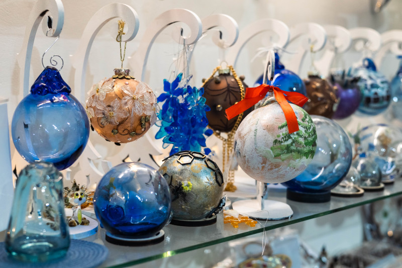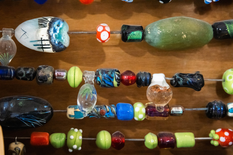 За столько лет в мастерской Надежды набралось огромное количество всевозможных изделий, которые выдуваются, в том числе во время мастер-классов. В школе мастера направо пойдешь – вазу найдешь, налево – елочные шарики, а прямо – бижутерию. Глаза начинают разбегаться. И все такое необычное и красивое. Тут вот кулончик из муранского стекла, тут серьги, похожие на сосульки. Сложно поверить, что до обработки это были старые разбитые бутылки. Надежда и сама носит украшения, сделанные своими руками. Например, в день нашей встречи она была в утонченном колье в виде сердечка.