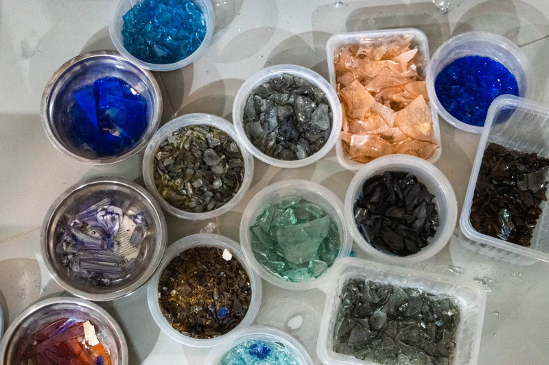 Рядом с печками у Надежды расположился «мини-завод» по переработке стекла. Здесь женщина вручную измельчает материал и собирает его в отдельные тары. Битое стекло выглядит как драгоценные металлы. В ход идут ненужные бутылки, вазы, колбы, флаконы от духов – вторсырье приносят простые люди.