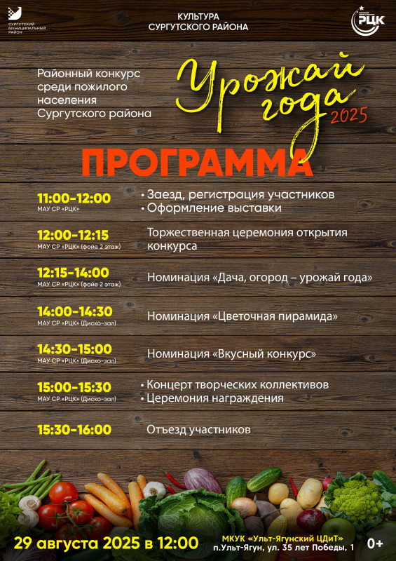В пятницу, 29 августа, в Ульт-Ягунском ЦДиТ на ул. 35 лет Победы пройдет районный конкурс «Урожай года – 2025». В каждой команде будут до десяти представителей пожилого населения Сургутского района.