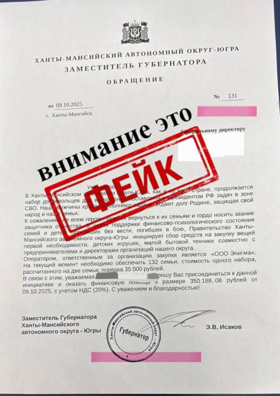 Аферисты рассылают чиновникам фейковое письмо от замгубернатора ХМАО о сборе денег на СВО