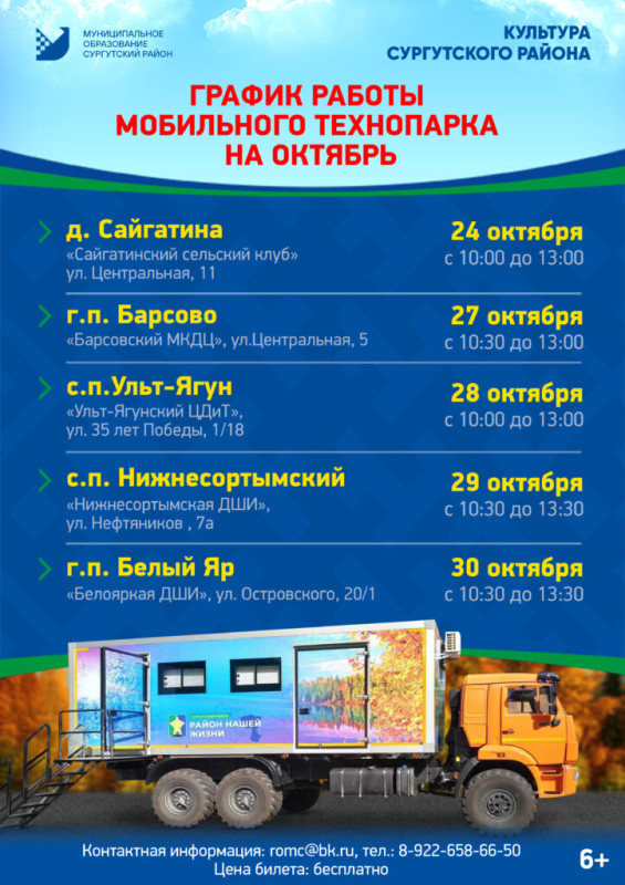 Мобильный технопарк начнет курсировать в пятницу, 24 октября. Первым его увидят посетители Сайгатинского сельского клуба. Передвижной комплекс также заедет в Барсово, Ульт-Ягун, Нижнесортымский и Белый Яр (6+). Все услуги в нем бесплатны.