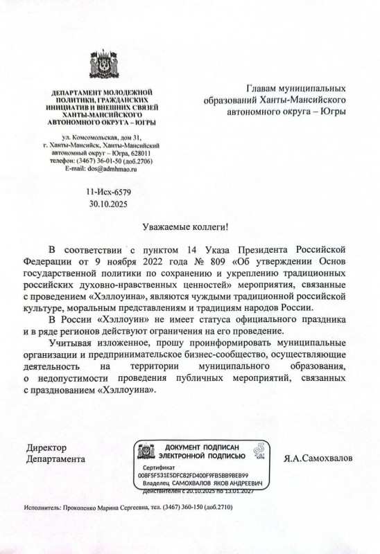 Письмо о «недопустимости проведения публичных мероприятий», приуроченных к Хэллоуину разослали главам муниципалитетов ХМАО. Соответствующий документ есть в распоряжении «Вестника».
