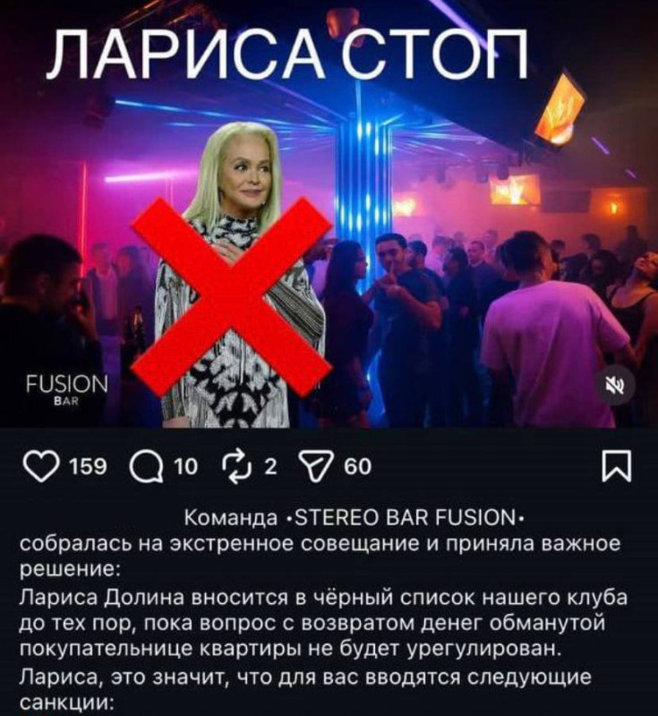 – Лариса Долина вносится в черный список нашего клуба. Все наши услуги вынуждены пройти мимо вас, – сказано на странице одного из заведений.