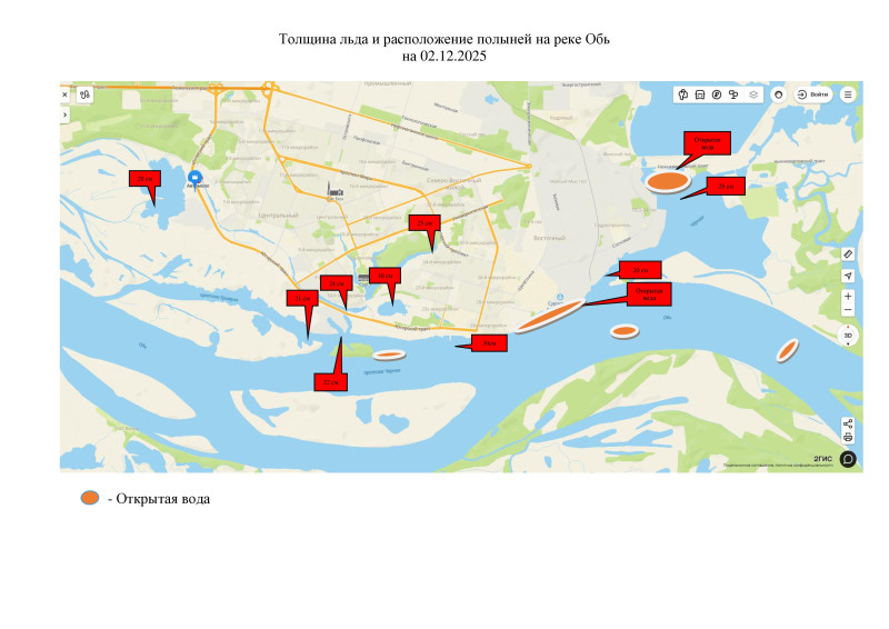 На карте указаны десять мест массового выхода людей на лед. Самую большую опасность несет участок Оби в районе речпорта, где льда вовсе нет, лишь открытая вода. Другим местом, которое несет угрозу, стала река Черная, в районе плотины водохранилища Сургутской ГРЭС-2, где тоже отсутствует лед.