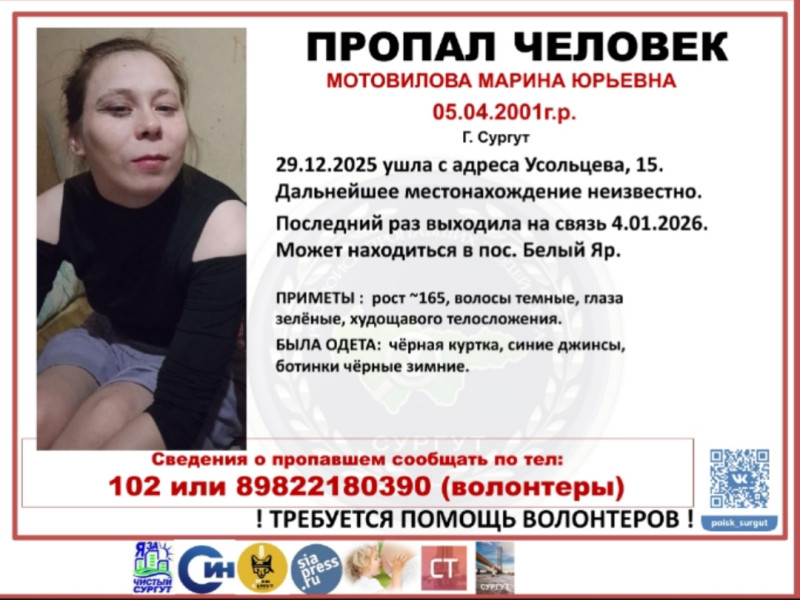 По информации, 29 декабря Марину Мотовилову видели по адресу Усольцева, 15. С тех пор ее местонахождение неизвестно.