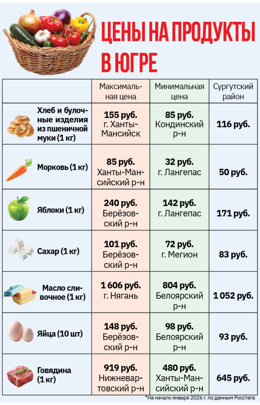 По данным Росстата на начало 2026 года стоимость самой дорогой говядины в Югре зафиксирована в Нижневартовском районе – почти 919 руб. за 1 кг, самой дешевой – в Ханты-Мансийском районе – 480 руб. за 1 кг. В Сургутском районе – 644,56 руб/кг. За молоко дороже всего платят жители Октябрьского района – почти 141 рубль за литр, дешевле всего в Нефтеюганске – 93,36 рубля за литр. В нашем районе – почти 110 руб. Самый «золотой» десяток яиц продают в Березовском районе – почти 148 рублей, самые дешевые можно найти в Югорске – почти 81 рубль. У нас – 92,5 руб.