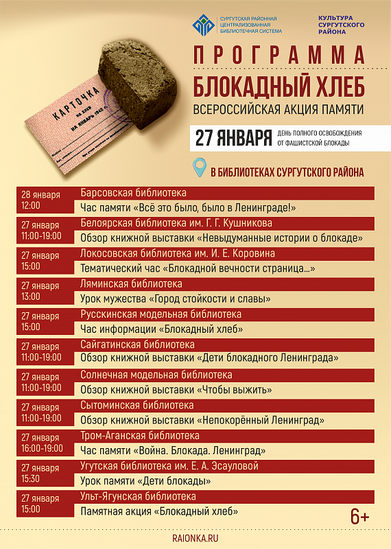 С 27 января жители Сургутского района примут участие в масштабной Всероссийской акции памяти «Блокадный хлеб», приуроченной ко Дню полного освобождения Ленинграда от фашистской блокады. Акция призвана напомнить о великом подвиге и невероятном мужестве жителей и защитников города на Неве, сообщает пресс-служба администрации Сургутского района.