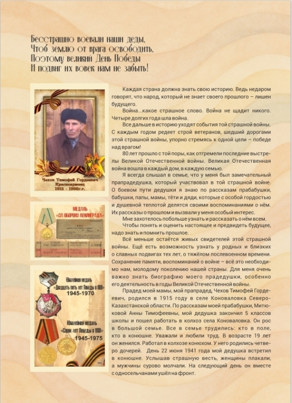 Работа, посвященная подвигу его прапрадеда в Великой Отечественной войне, была подготовлена при поддержке воспитателей детского сада «Северное сияние». Сохранение памяти о героях разных поколений входит в проект «Единой России» «Историческая память» и нацпроект «Семья».