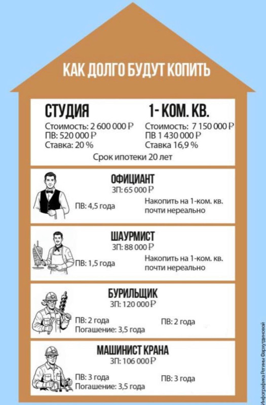 А вот шаурмист сможет накопить на ПВ «однушки» за 3 года и 7 месяцев. Только даже его доход не покроет дальнейший платеж по ипотеке. Получается, сотрудникам общепита на свою зарплату однокомнатная квартира не светит. Так кем зумерам нужно работать, чтобы позволить себе такую роскошь, как свое жилье?
