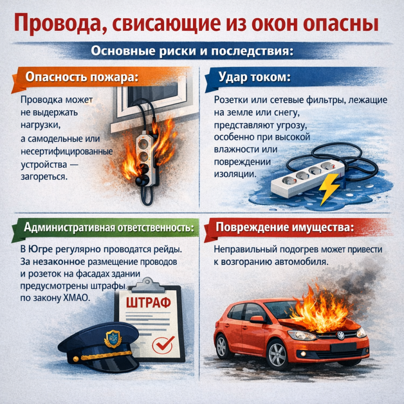 Есть на Севере одна зимняя традиция – «наряжать» улицы в провода. Буквально у каждого дома гирлянды из удлинителей. В Лянторе они то протянуты аккуратно, то болтаются на уровне лица. Водители греют машины как могут. Оно и понятно, штатный автозапуск – дорого, а домашняя розетка – почти бесплатно. И не страшно, что она на пятом этаже, не страшно, что натирается дверью или лежит под ногами у прохожих. Правда в том, что это – страшно. И вот почему.