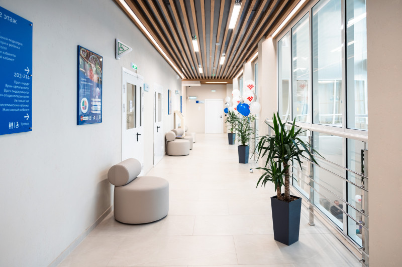 Новая поликлиника начинает удивлять прямо на входе – просторное фойе с панорамными окнами совсем не походит на медучреждение. Дизайнерская отделка и лаконичные декорации создают атмосферу, противоположной обычной больничной обстановке. Но гораздо больший восторг вызывает то, что находится в кабинетах. Поликлиника снабжена новейшим оборудованием, благодаря которому пациенты смогут получать широкий спектр услуг.