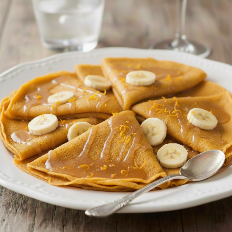 Рецепт: в муку добавьте цедру половины апельсина, а дальше замесите смесь как обычно. Когда начнете выливать тесто на сковороду, разложите на ней тонкие кружочки бананов.