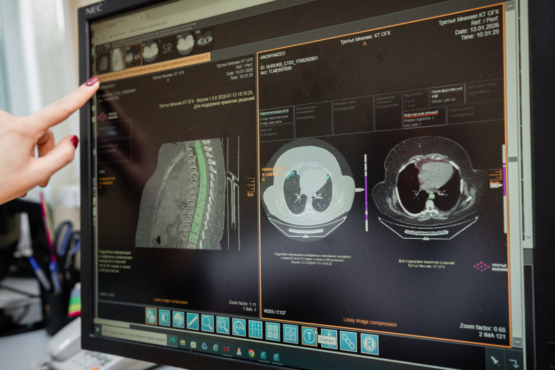 Перемещаемся с корабля в Сургутскую окружную клиническую больницу. Мы в неприметном кабинете с двумя компьютерами. Рентгенолог отточенными движениями мыши показывает результаты сложнейшего с технологической точки зрения исследования. На компьютерной тамограмме (КТ) сотни слоев грудной клетки пациента, обработанные ИИ.