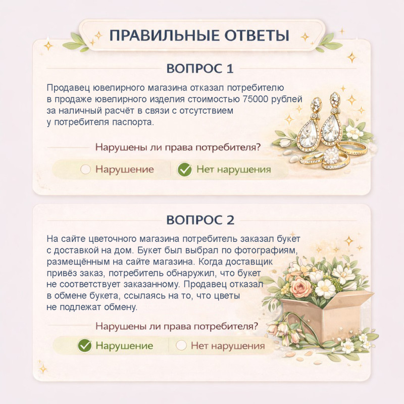 Переживая за ваш кошелек, дорогой читатель, мы изучили задания квеста и поняли – вы тоже должны это знать. Делимся решениями двух популярных дилемм, актуальных к 8 Марта. Это вопрос продажи ювелирных изделий и цветов. Изучите карточку с правильными ответами и не забывайте, нюансы, конечно, есть всегда, но закон на стороне потребителя!