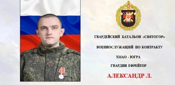Гвардии ефрейтор Александр из Югры служит в батальоне «Святогор» санитаром разведывательной роты. Он заключил контракт с Минобороны РФ в феврале 2022 года. Во время штурма опорного пункта противника в одном из районов ДНР, он уничтожил двух врагов, а потом оказал помощь раненым под обстрелами товарищам.
