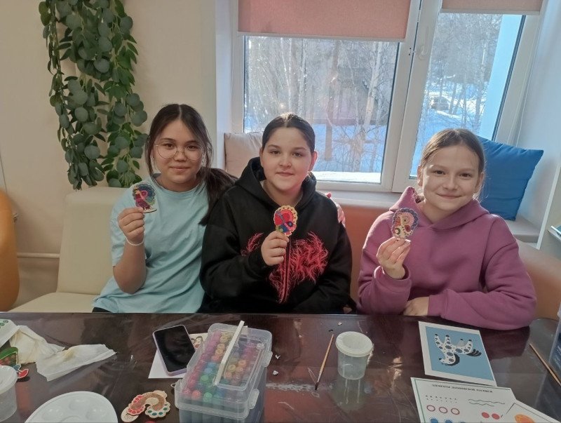 На двух верхних этажах библиотеки царит веселье. На творческих мастерских каждый находит занятие по душе. Четвероклассница Агата Сопрун раскрашивает фломастерами деревянную фигурку индюка в стиле дымковской игрушки.