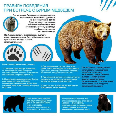 – не приближайтесь в местах возможного нахождения медведя к останкам павших животных, другим возможным поводам. Потревоженный на добыче медведь в большинстве случаев переходит в нападение.