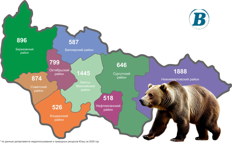 Согласно отчету депнедра Югры за 2025 год, всего в регионе 8179 мишек. Больше всего косолапых обитает в Нижневартовском и Ханты-Мансийском районах. Меньшая вероятность встретить хищника в Нефтеюганском и Кондинском районах.