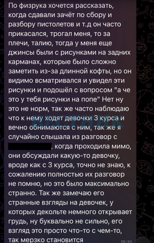 Вторая часть претензий касается преподавателя физической культуры. Студентки сообщают о навязчивых прикосновениях. Физрук якобы трогает девочек во время занятий, обнимает за плечи и талию.